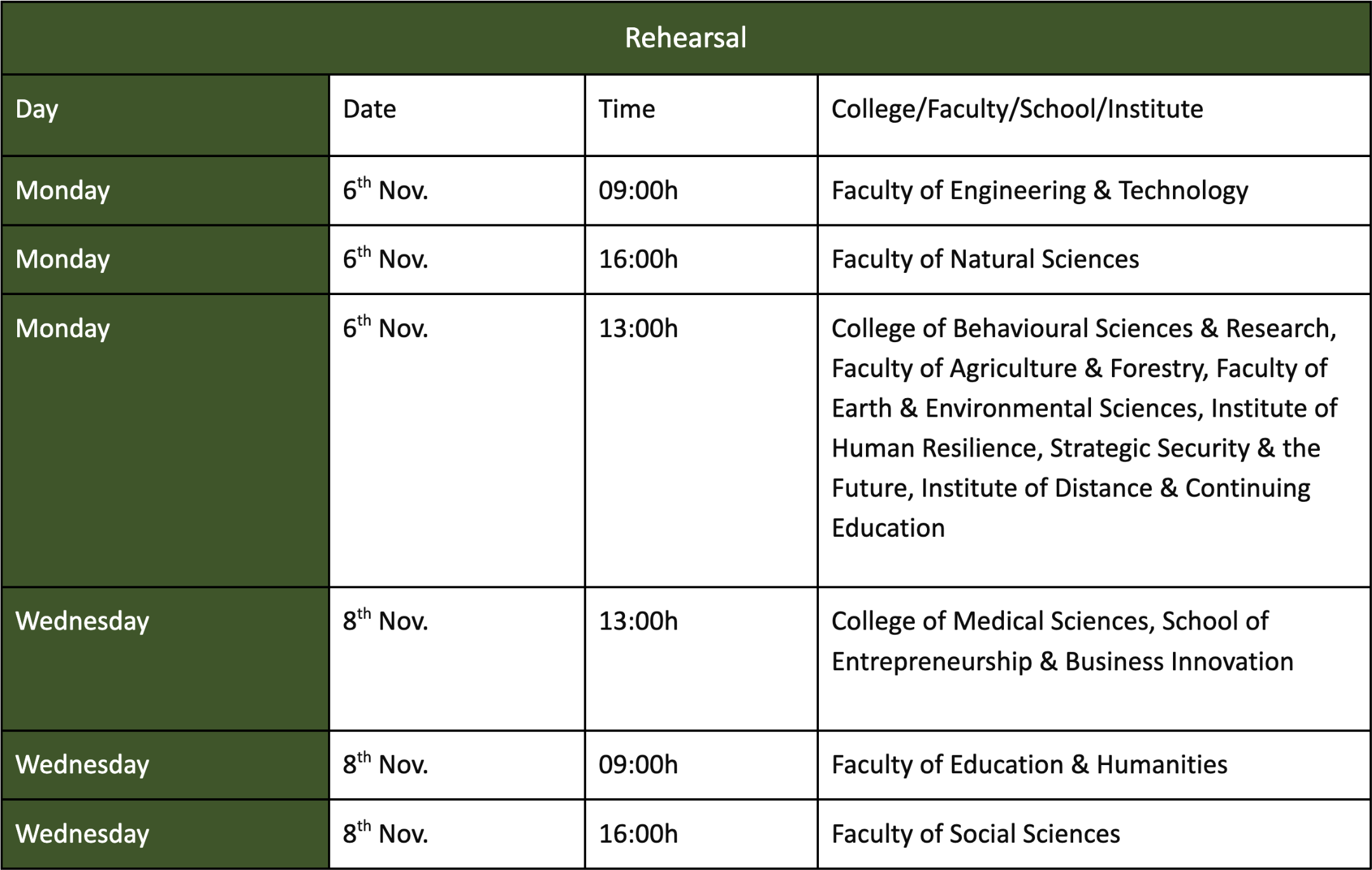 The graduation ceremonies will be held at the National Cultural Centre for Turkeyen Campus Graduands and at the Tain Campus for Berbice Graduands and will follow the schedule outlined in the table below: