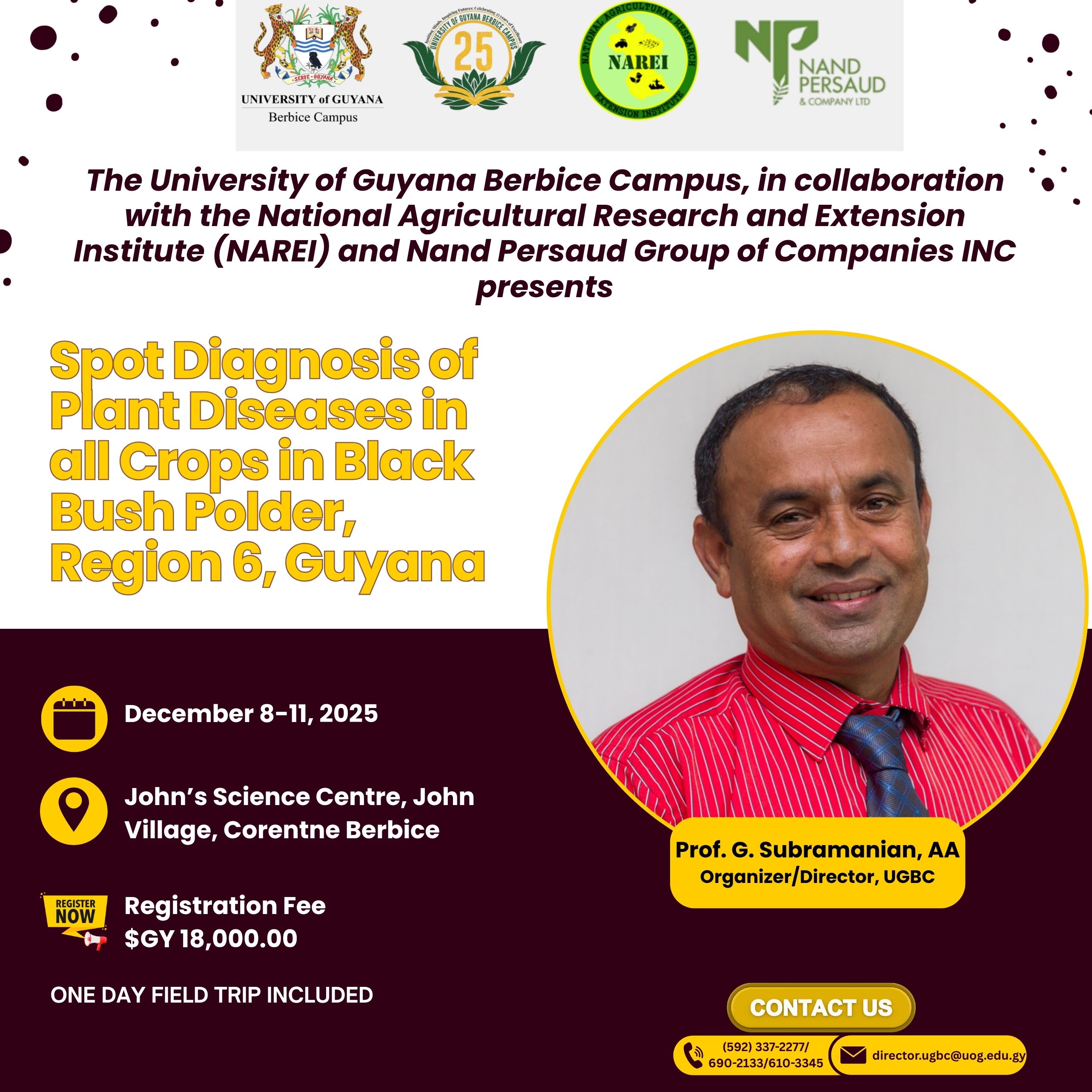Invitation to training workshop: Spot Diagnosis of Plant Diseases in all Crops in Black Bush Polder from December 8-11, 2025 at John's Science Centre, John Village, Corentyne, Berbice.