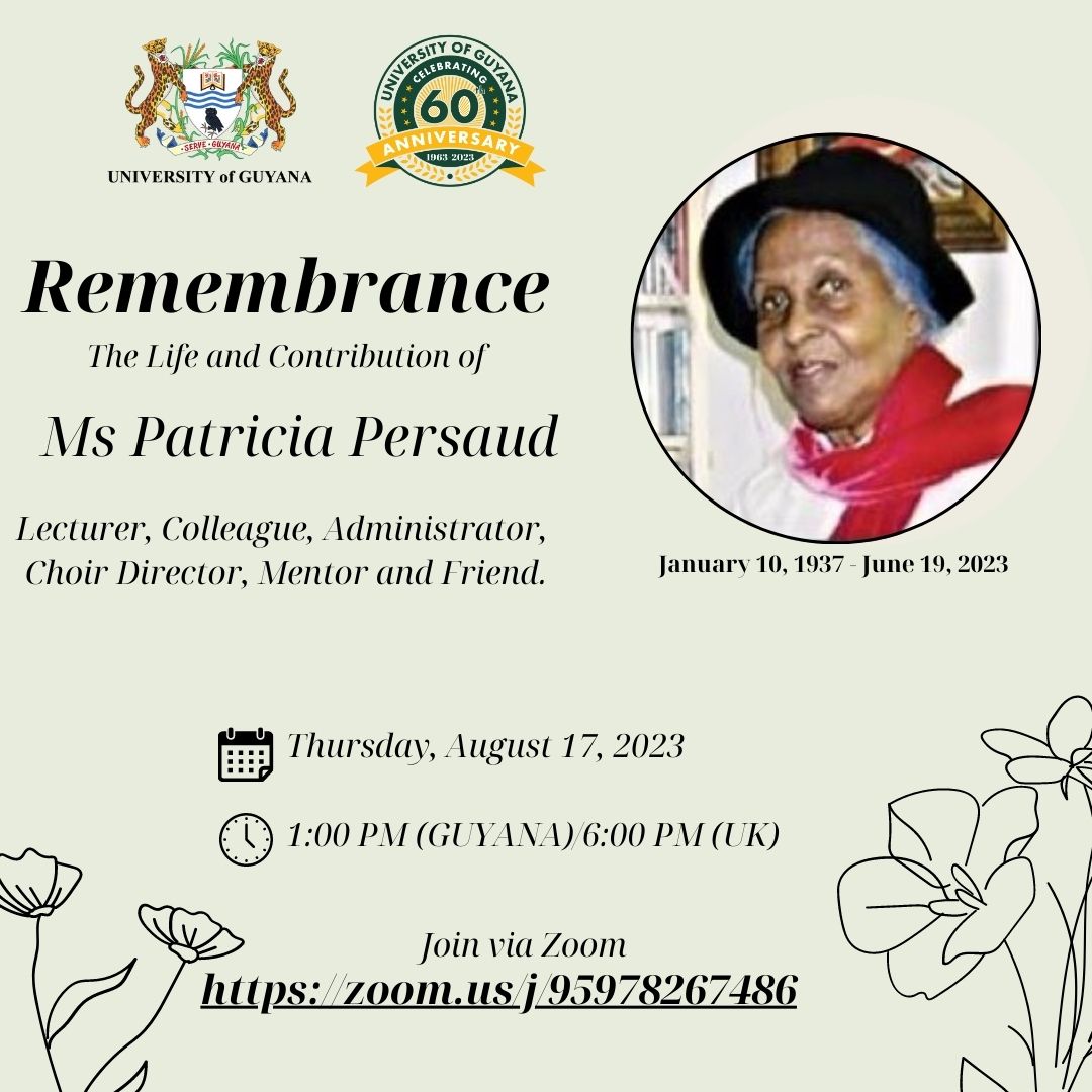 Invitation: Remembrance- The life and Contribution of Ms Patricia Persaud Wednesday, August 16, 2023 - 08:28