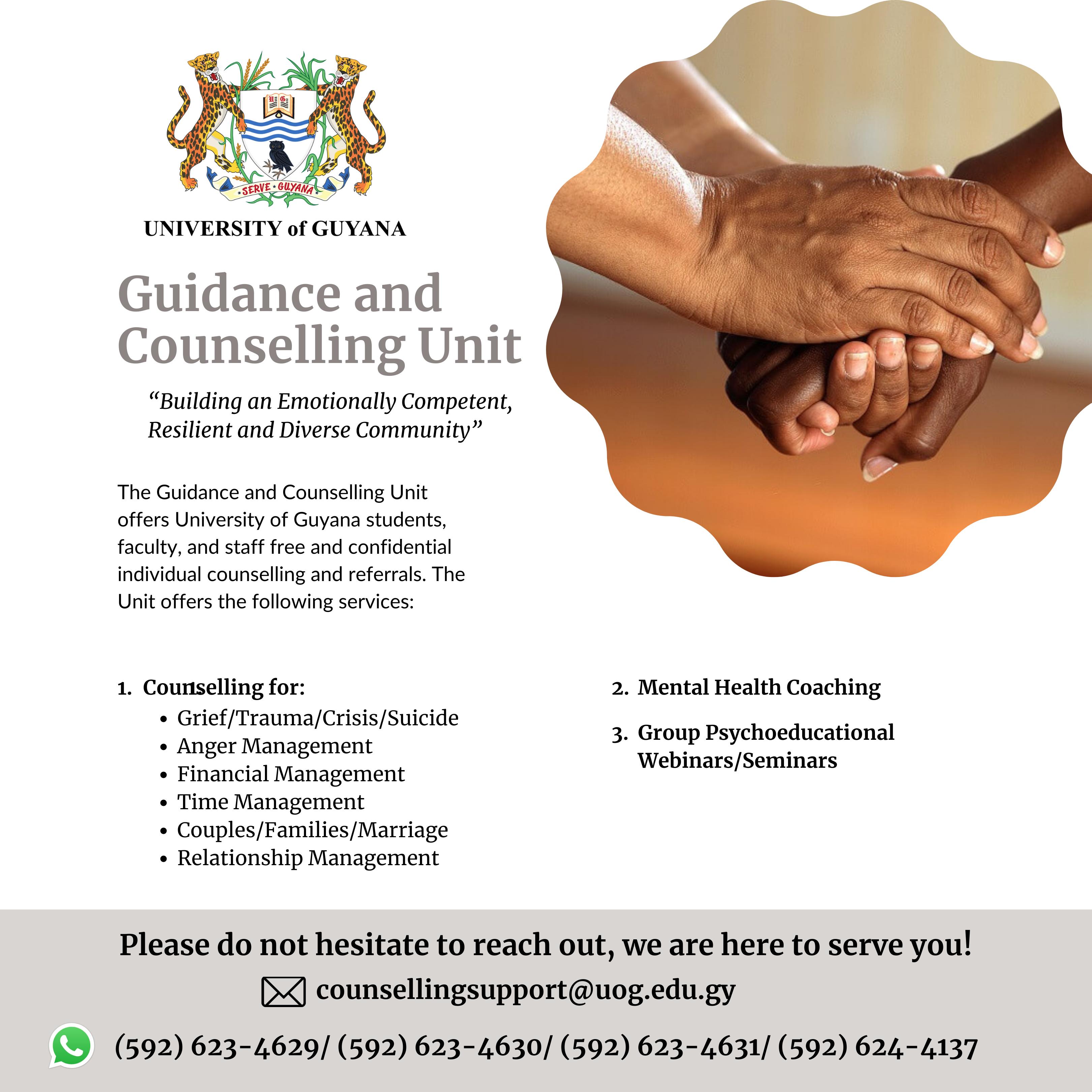 The University of Guyana, Guidance and Counselling Unit wishes to encourage staff, students and faculty representatives to take full advantage of the free and confidential counselling services available.