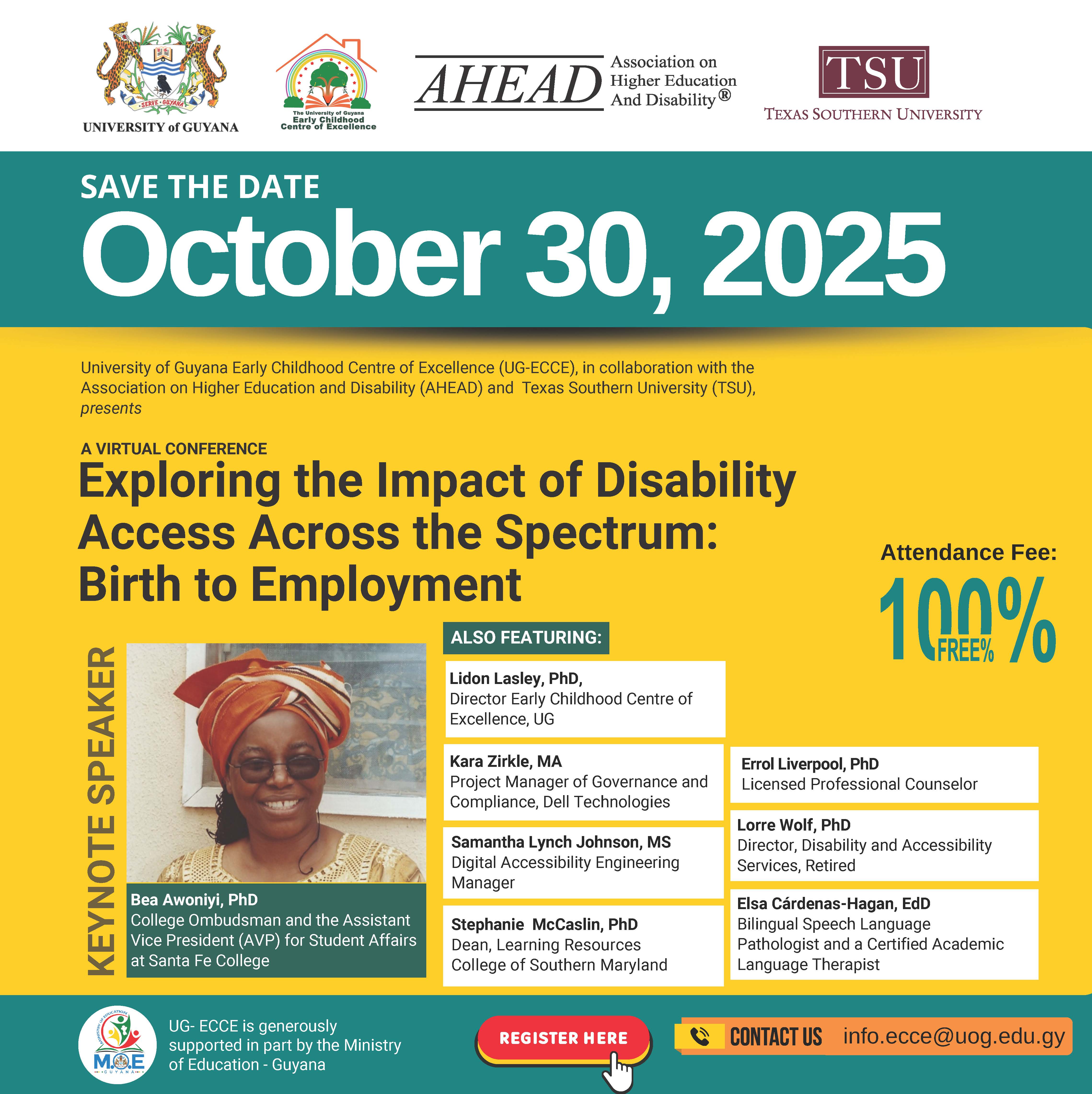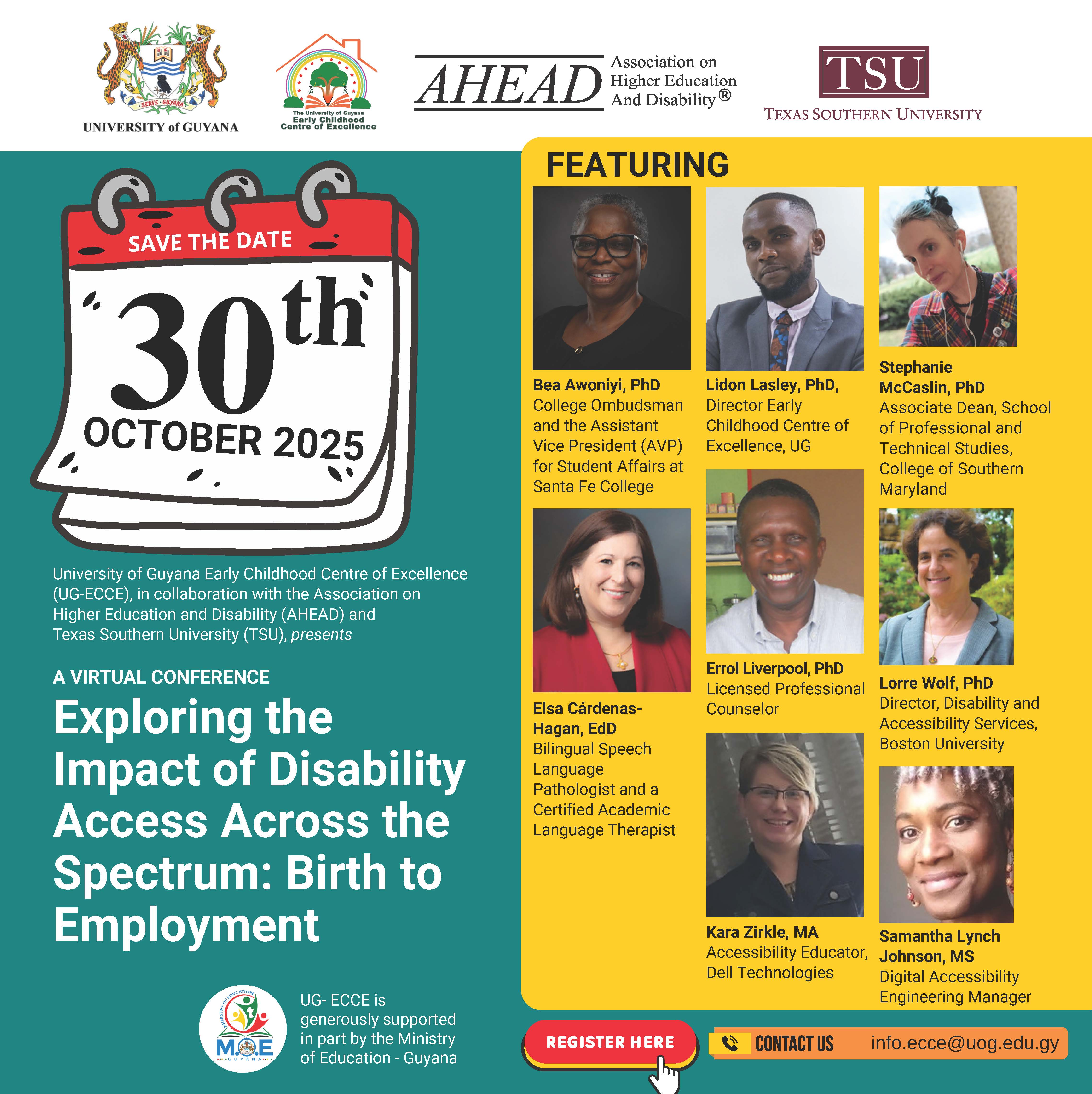 Tuesday, August 26, 2025 - 09:33Please see below, the Save the Date flyers for UG-ECCE Virtual Conference on October 30, 2025. Persons interested in attending the event may register at https://zoom.us/webinar/register/WN_1vWL4oUvTKyXBuXKFZ0ygQ#/registration or contact: info.ecce@uog.edu.gy for more information.