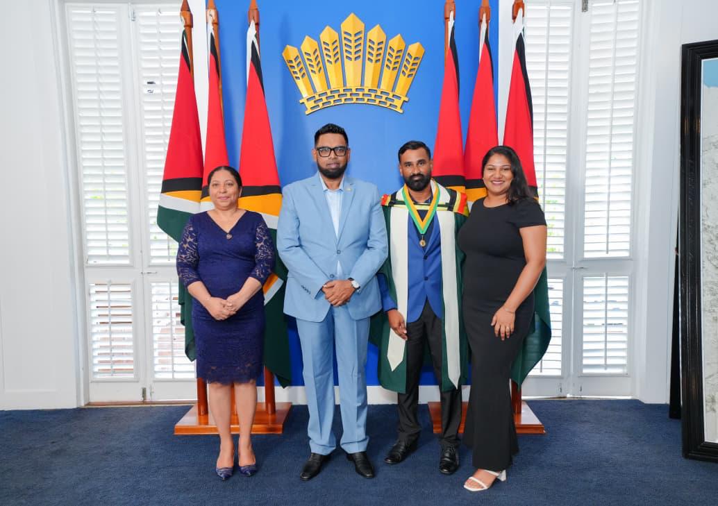 Professor Paloma Mohamed Martin, Vice Chancellor of the University of Guyana; His Excellency Dr. Mohamed Irfaan Ali, President of the Cooperative Republic of Guyana; Daniel Persaud, University of Guyana’s 2025 Valedictorian; and his Friend Chelsea Balkarran, pose for a photo at the Office of the President where Persaud received the President’s Medal.