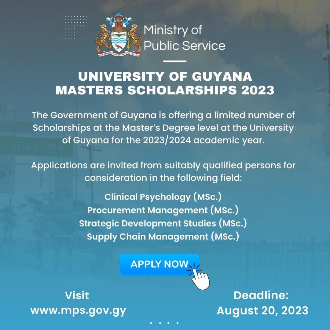 The Government of Guyana is offering a limited number of Scholarships at the Master's Degree level at the University of Guyana for the Academic Year 2023/2024.