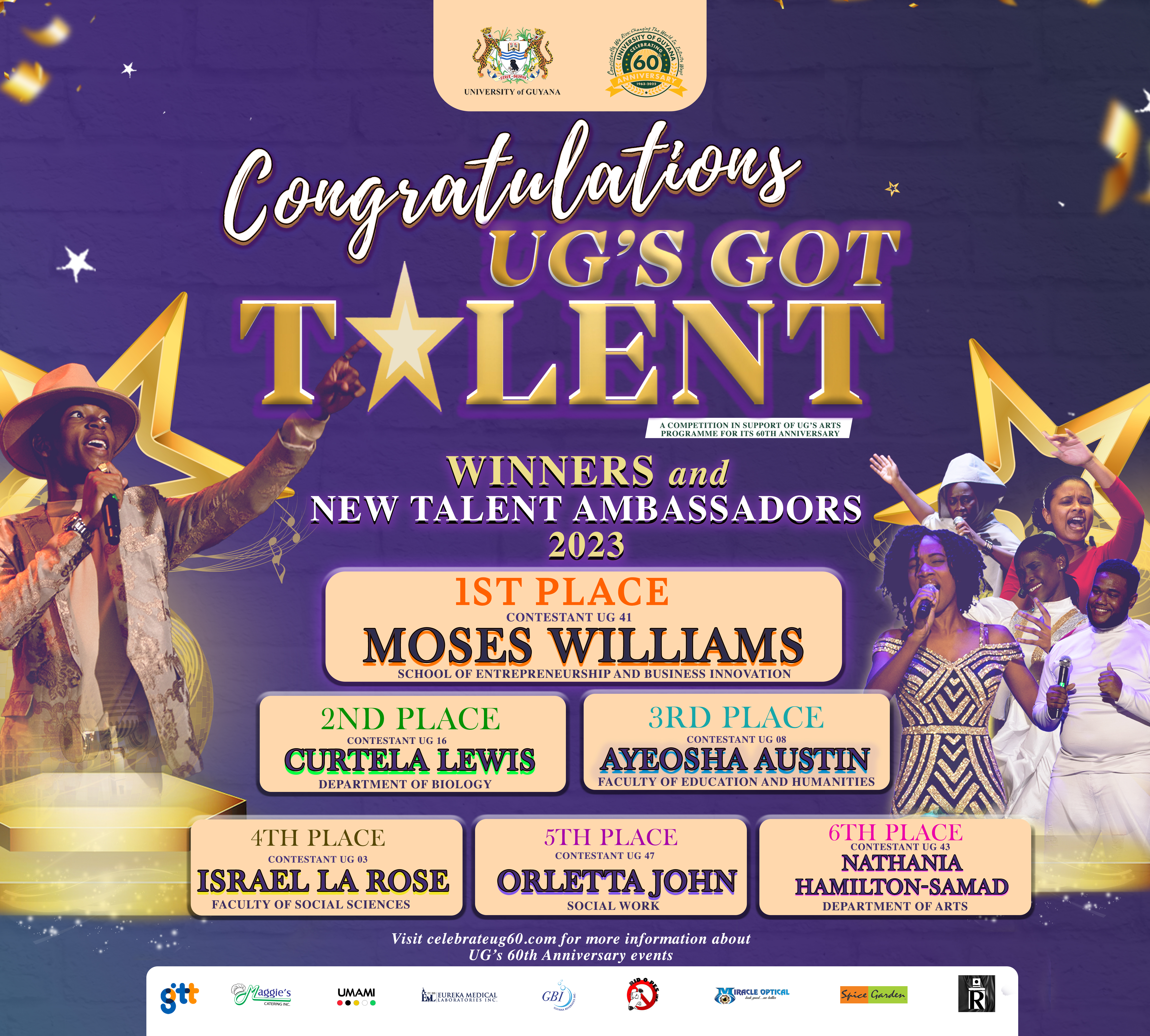CONGRATULATIONS: UG's Got Talent Winners and New Talent Ambassadors 2023 Saturday, August 5, 2023 - 20:07 Dear Students, We celebrate our UG's Got Talent Winners and New Talent Ambassadors 2023.