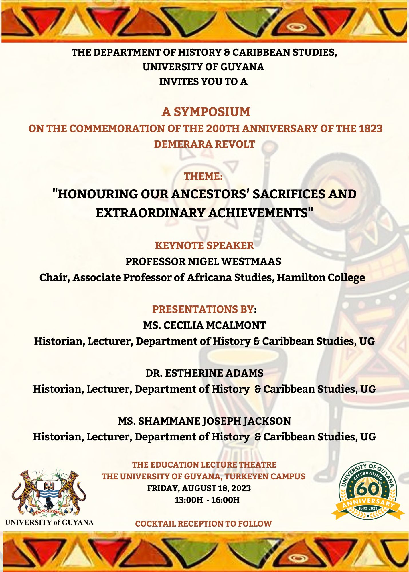The University of Guyana, Faculty of Education and Humanities, Department of History and Caribbean Studies invites you to a Symposium on the Commemoration of the 200th Anniversary of the 1823 Demerara Revolt under the theme, "Honouring our Ancestors' Sacrifices and Extraordinary Achievements" on Friday, August 18, 2023, at the Education Lecture Theatre, Turkeyen Campus from 13:00 hrs to 16:00 hrs.